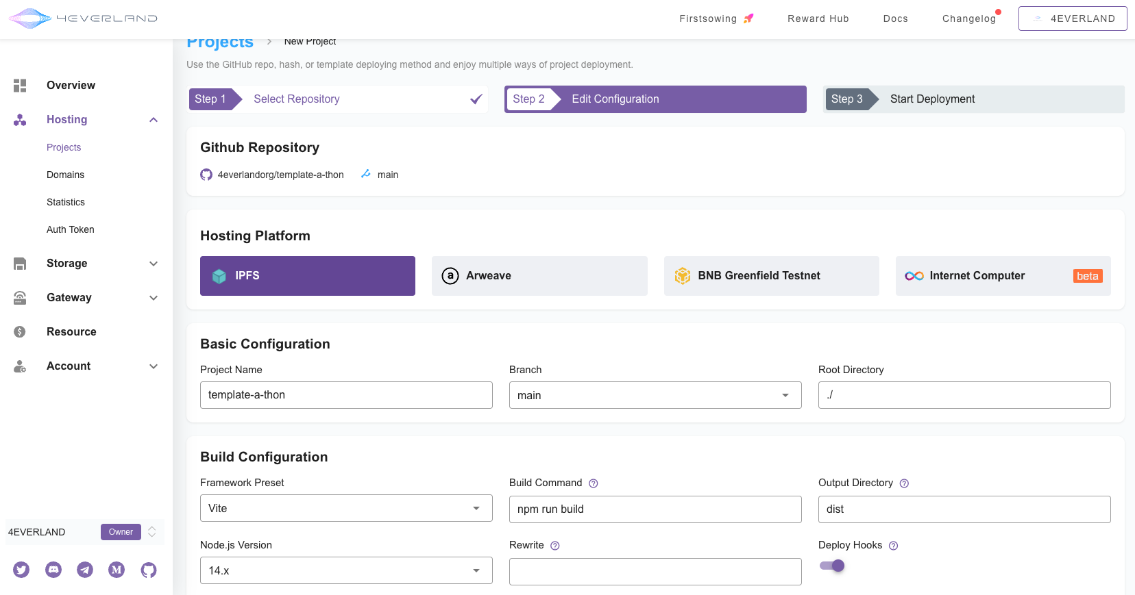 4EVERLAND Hosting supports IPFS, Arweave, BNB Greenfield, and Internet Computer automatic deployment, please choose the platform you need to deploy according to your needs, here we take IPFS as an example.