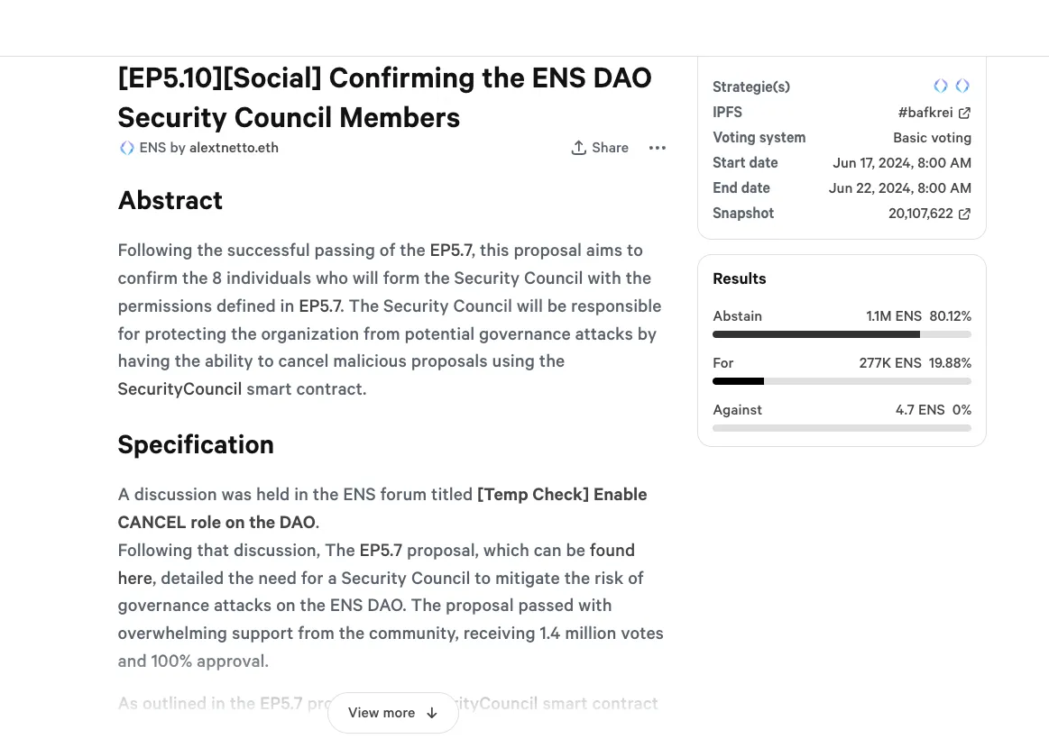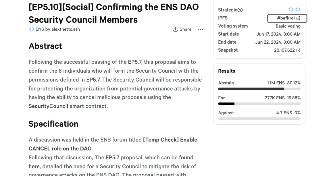 These voting systems are used to calculate voting results based on voting power. For example, in the latest proposal within the [ENS space](https://snapshot.org/#/ens.eth/proposal/0xa0b1bfadf6853b5b0d59d3c4d73c434fc6389339887d05de805361372eb17c3a), the *Security Council Members*. This societal proposal aims to confirm a full list of 8 individuals as members of the Security Council. The voting will be a simple For/Against/Abstain vote on the entire list. If the proposal succeeds, a separate executable proposal will be put forward to deploy the Security Council smart contract and allocate the necessary roles.